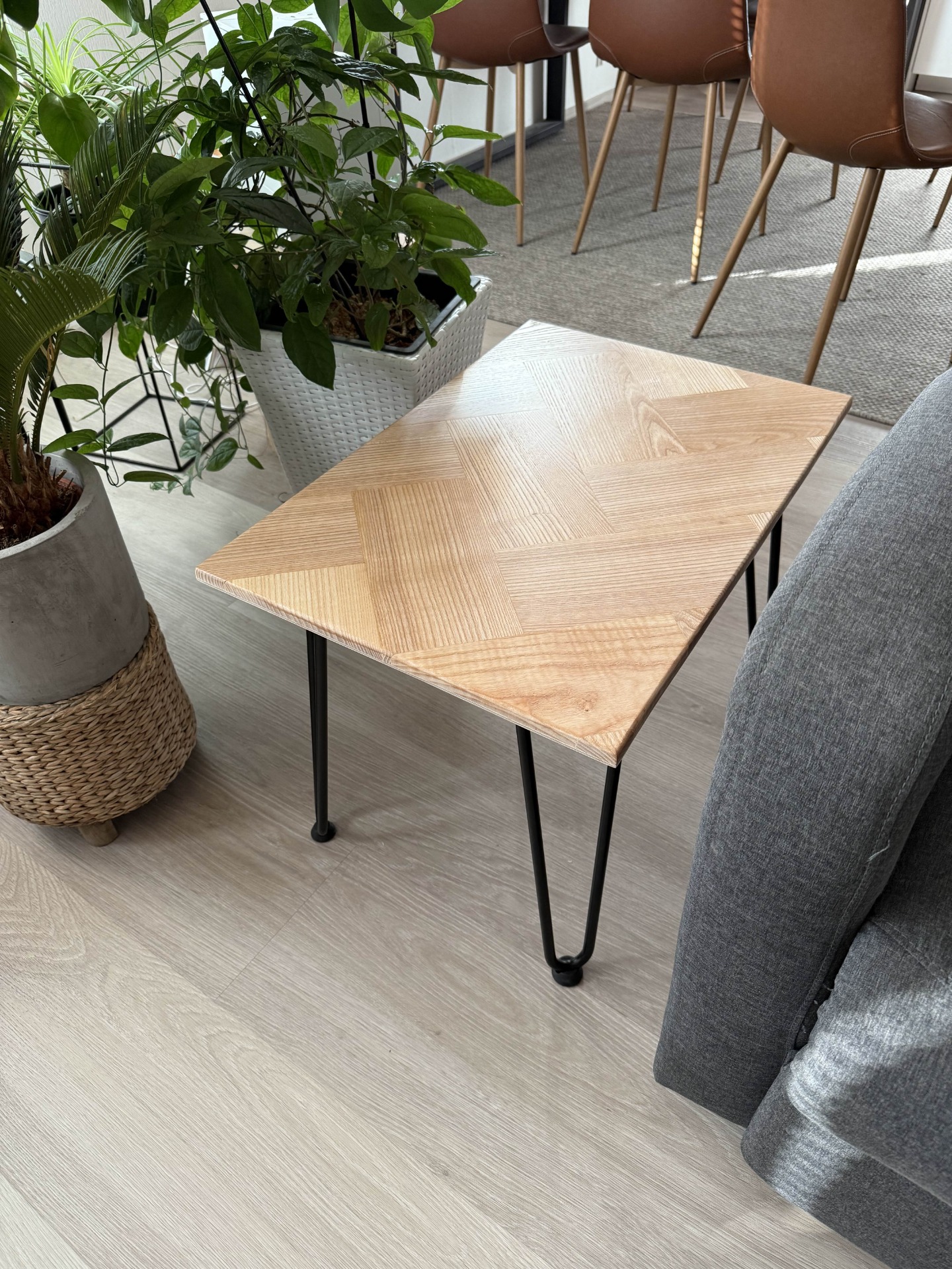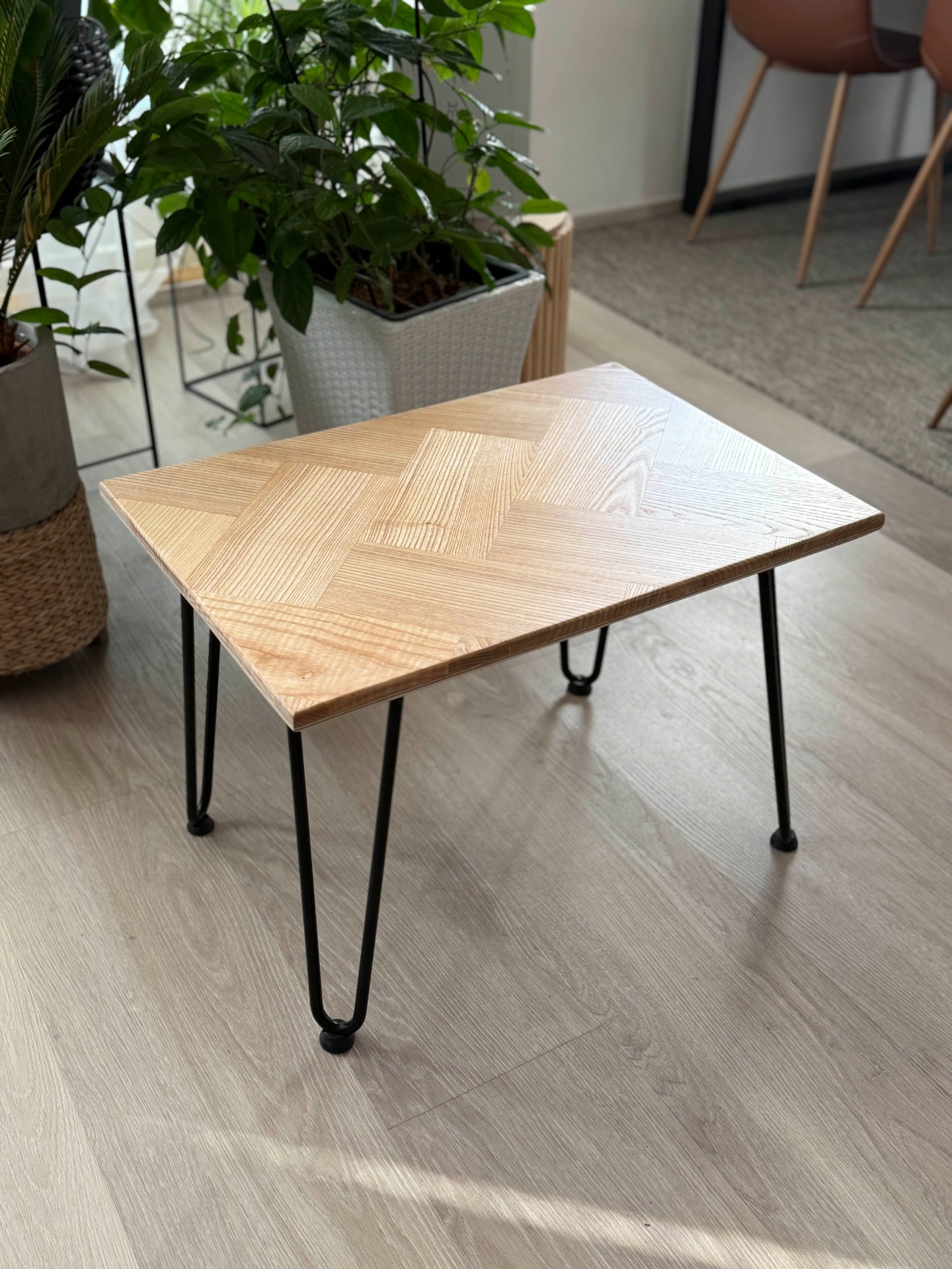 Mustat metalliset hiusneulajalat antavat pöydälle kevyen, modernin siluetin ja tuovat samalla tukevuutta ja kestävyyttä. Minimalistisen muotoilunsa ansiosta pöytä sopii erinomaisesti niin olohuoneeseen, lukunurkkaukseen kuin viherkasvien rinnallekin.