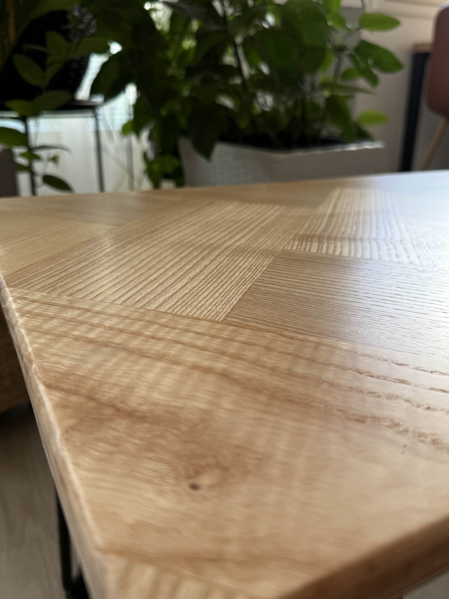 Pöydänkansi on valmistettu kauniista saarni puusta, jossa herringbone-tyylinen pintakuviokuvio tuo elävyyttä ja hienostunutta ilmettä. Luonnollinen, vaaleasävyinen puupinta heijastaa valoa pehmeästi ja korostaa puun aitoa syykuviota.