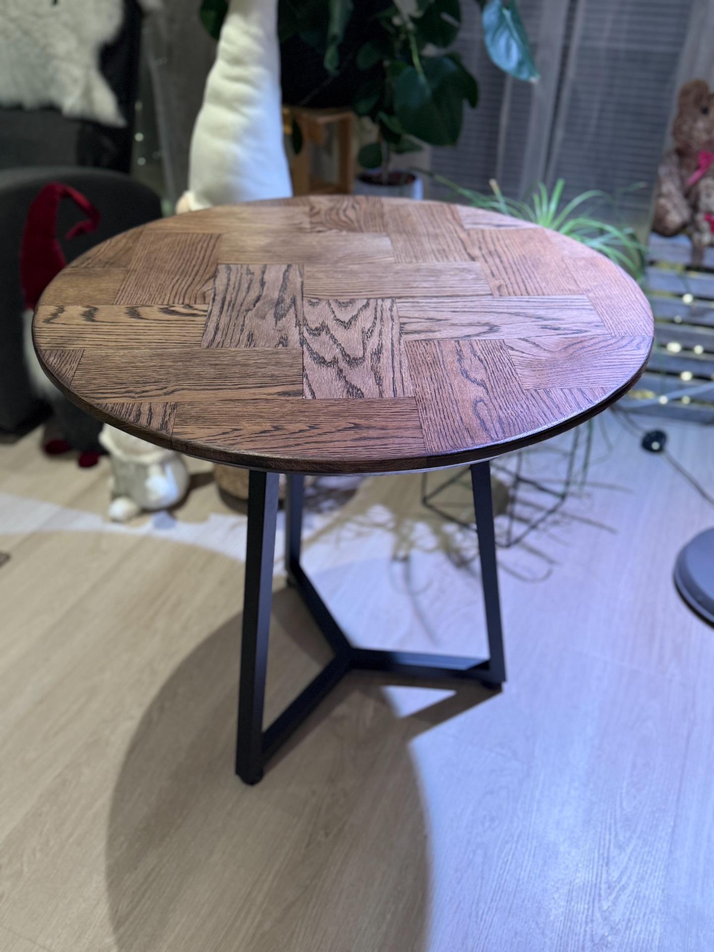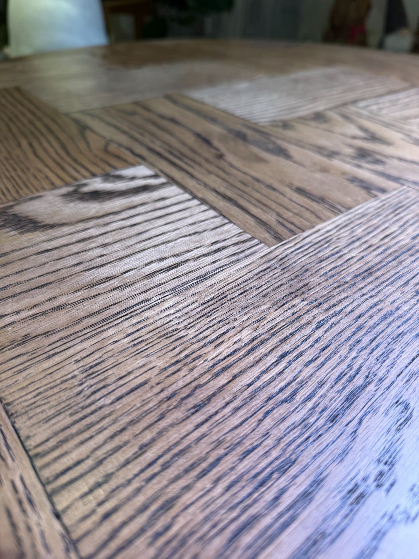 Tuo keittiöösi modernia eleganssia tällä kauniilla pyöreällä ruokapöydällä. Luonnollinen puupinta kalanruotokuvioinnilla tekee jokaisesta pöydästä uniikin, ja yhdistyy saumattomasti monenlaiseen sisustustyyliin.